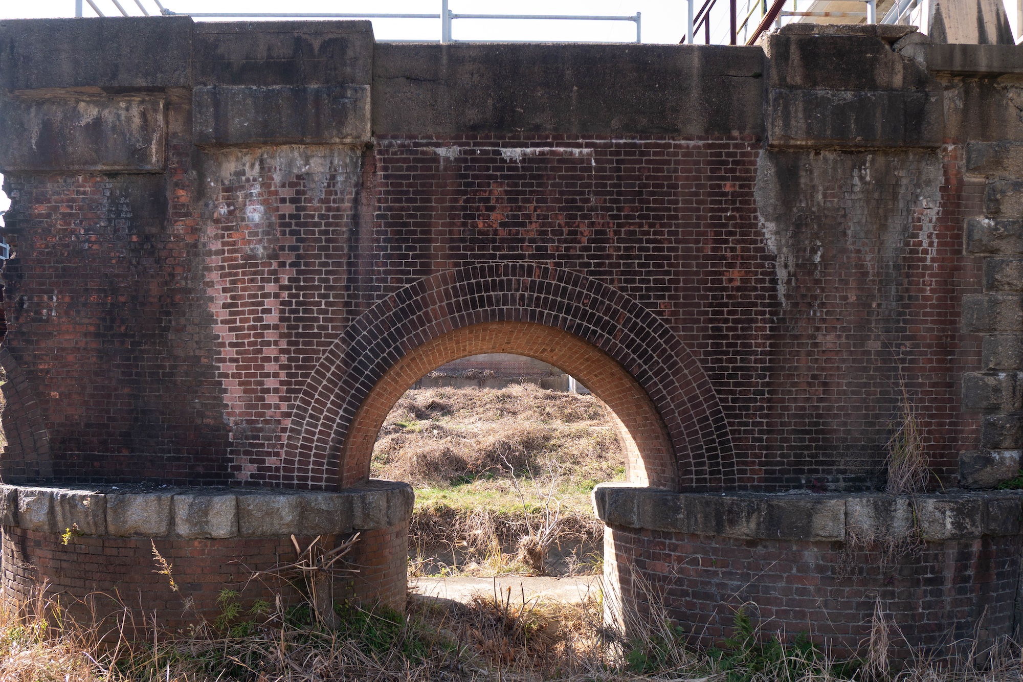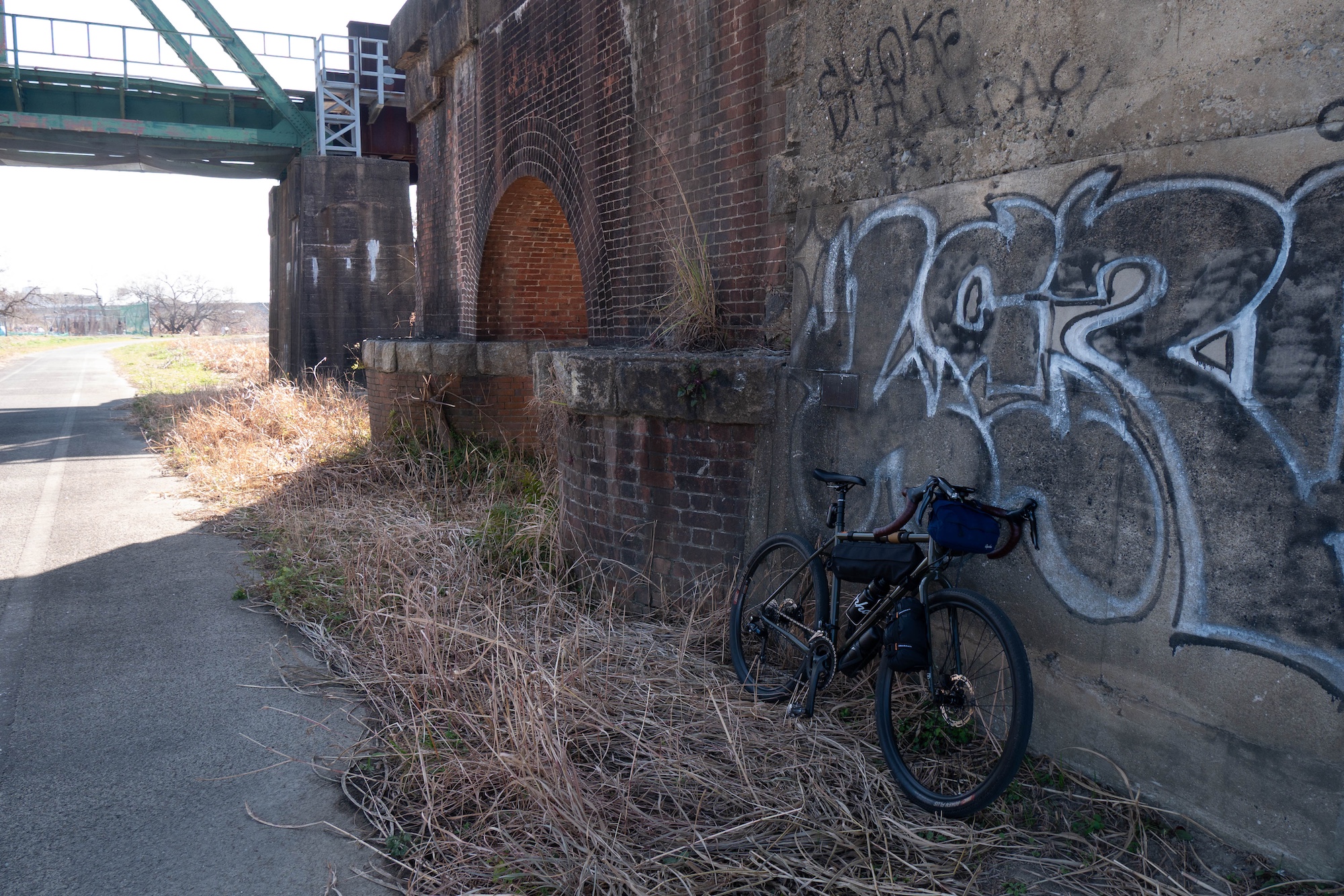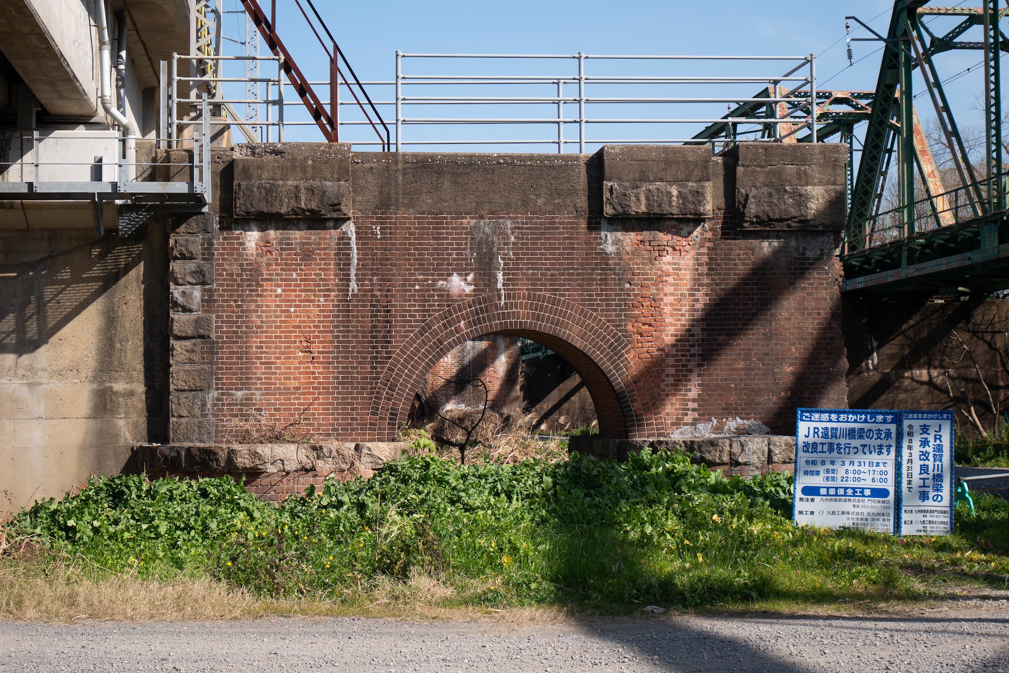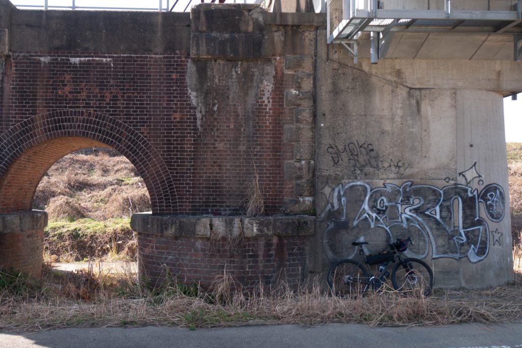 昼食後、遠賀川のサイクリングロードを走ってると、途中に煉瓦造りの橋脚が残っていました。鉄道には詳しくないので、後で調べると、遠賀川橋梁(おんががわきょうりょう)といい、筑豊地方の石炭輸送強化のため、明治時代に作られた鉄橋のようです。美しいアーチ型の煉瓦造がしっかりと残っていました。