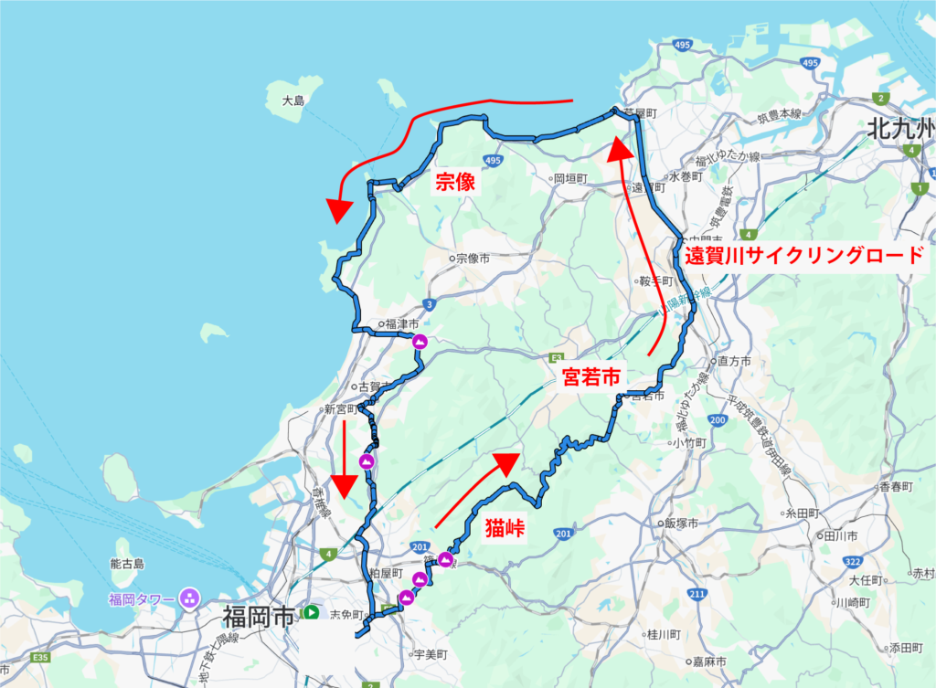 篠栗->宮若市->遠賀川->宗像を通って戻って来る周回ルートです。